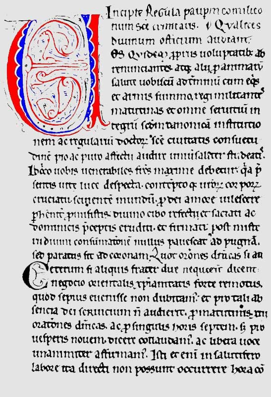 Wir wenden uns zuerst an alle diejenigen, welche ihrem eigenen Willen zu folgen verschmähen und mit reinem Herzen dem höchsten Könige Ritterdienste zu tun begehren und mit eifriger Sorgfalt die sehr edle Rüstung des Gehorsams auszufüllen sich bemühen und dieselbe auch dauernd ausfüllen. Und so ermahnen wir euch, die ihr bis jetzt weltliches Rittertum ausgeübt habt, wobei nicht Jesus Christus die Ursache war, sondern allein um der Gunst der Menschen willen habt ihr ihm (dem Rittertum) euch zugewandt, daß ihr denen folgt, welche Gott aus der Masse der Verdammnis auserlesen und damit seine Gnade und Barmherzigkeit zur Verteidigung der heiligen Kirche berufen hat, und euch beeilet, ihnen für immer Euch zuzugesellen.